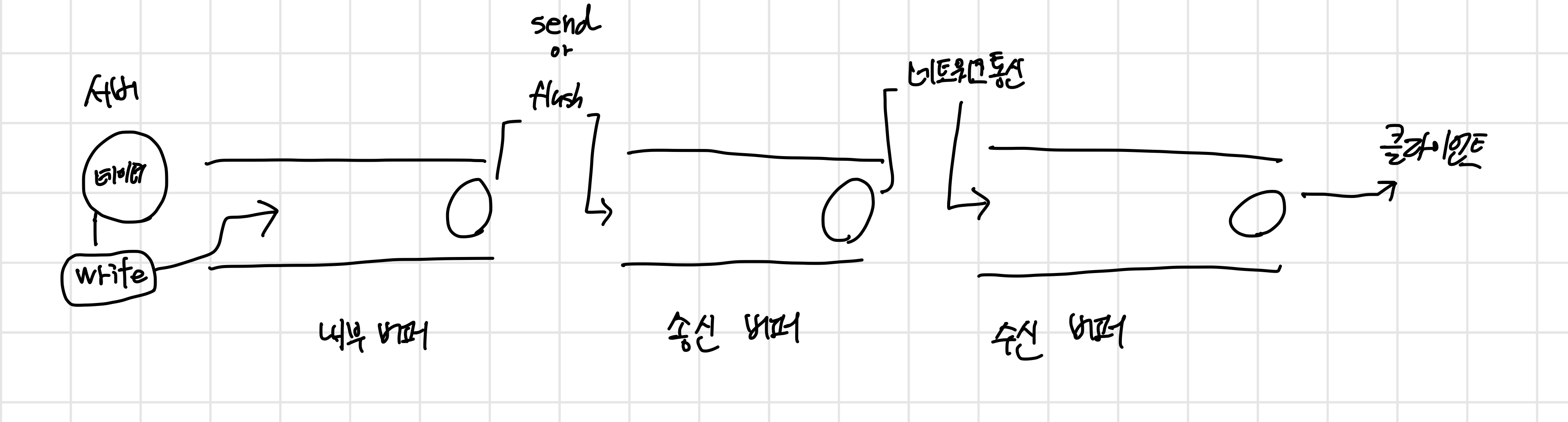 소켓에서 클라이언트에게 통신할 때, 거치는 버퍼가 총 3개의 버퍼가 있다 내부버퍼, 송신버퍼, 수신버퍼 이렇게 총 3가지가 있다.
