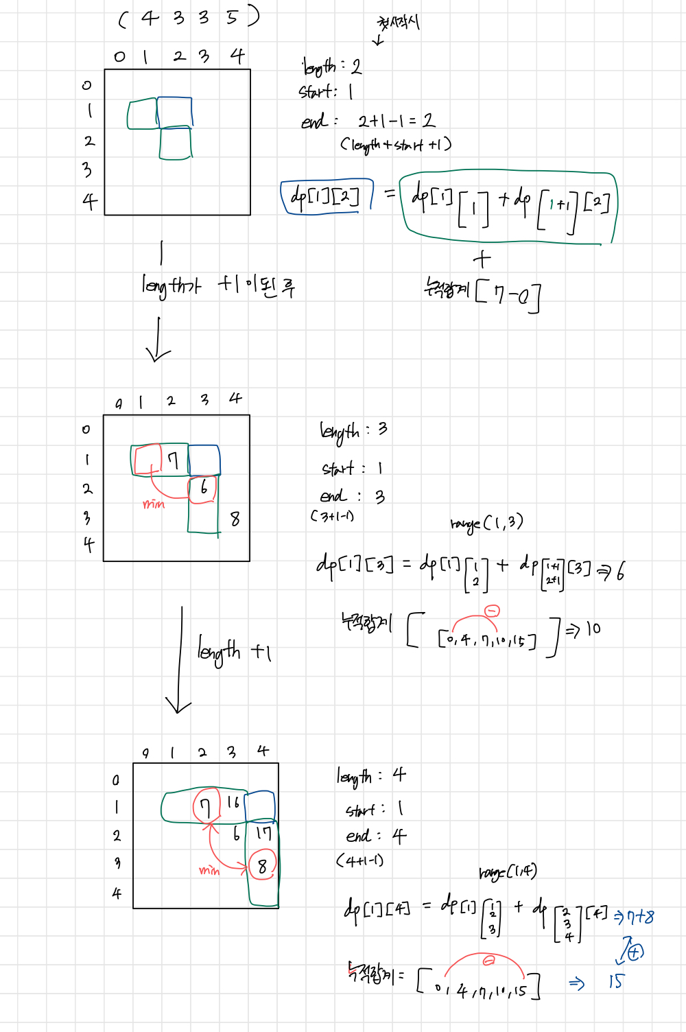 dp[start][end] = min( [ dp[start][mid] + dp[mid+1][end] for mid in range(start,end)] ) + prefix_sum[end] - prefix_sum[start-1]