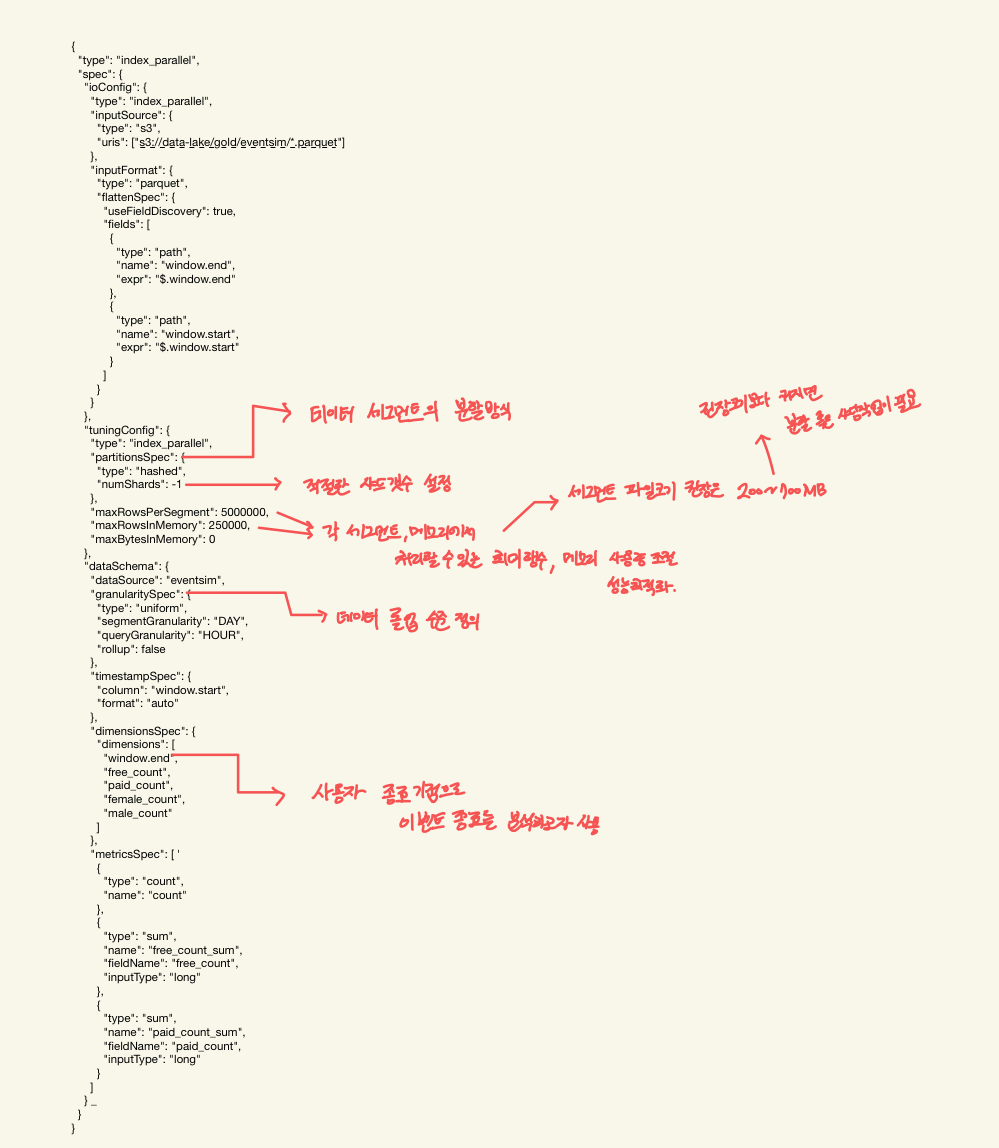 다음으로는 Druid 작업 스펙을 작성하는 방법인데 이 부분은 Druid Document를 참고하면 더 자세한 정보를 얻을 수 있다,