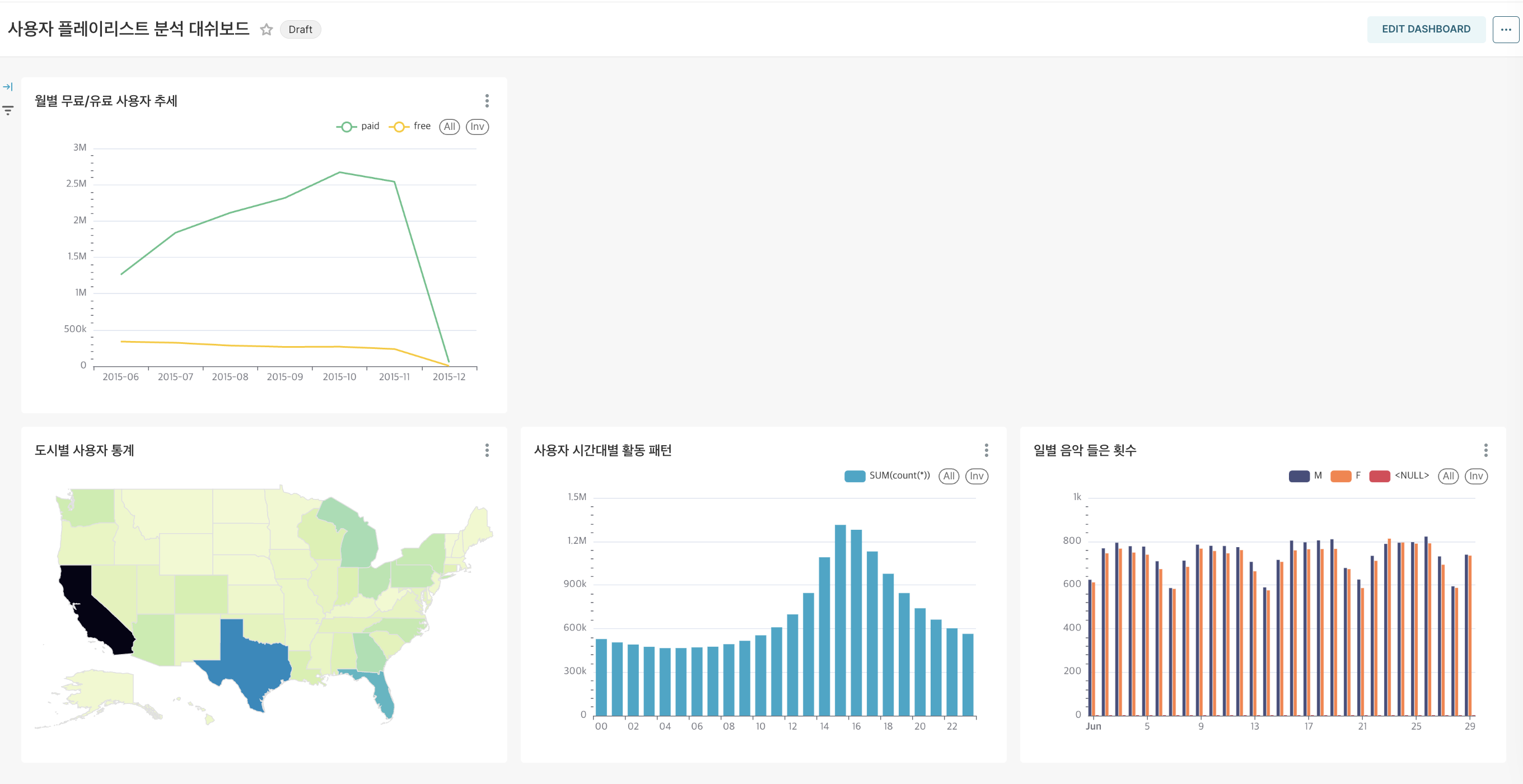 이전 게시물에서 SuperSet를 활용해 시각화 할 수 있는 데이터들을 MySQL로 마이그레이션하는 작업을 진행하였다. 그 데이터들을 기준으로 Superset를 활용해 차트를 만들고, 해당 차트들을 대쉬보드에 붙여넣어서 최종적으로 보기 좋은 대쉬보드를 구성하는 것이 중요한 목표인 것 같다. 하지만 나같은 경우 데이터를 시각화하는 방법에 대해 정확한 인사이트가 없어서 제공해주는 Superset의 UI를 유추만으로 만들어서 굉장히 조약하게 만들 수밖에 없었다.. 이렇게 구성해보았는데, 월별 무료/유료 사용자 추세를 차트라인으로 만들었고, 도시별 사용자 통계는 도시별로 그룹바이를 하여, 총 사용자들을 카운트하여, 해당 미국 도시별 제공해주는 유니코드? 도시코드? 컬럼을 활용해 각각의 지역들을 맵핑해줄 수 있었..